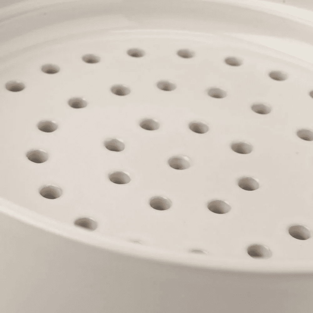 كل ما عليك فعله هو إضافة الماء إلى القدر، وضع الإدراج فوقه، ثم ترتيب المكونات، مع التأكد من أن الماء لا يلامس قاعدة الإدراج. بمجرد أن يبدأ الماء بالغليان، ستحصل على وجبة مطهية بالبخار بطريقة متوازنة وصحية – بدون زيت وبدون مجهود.