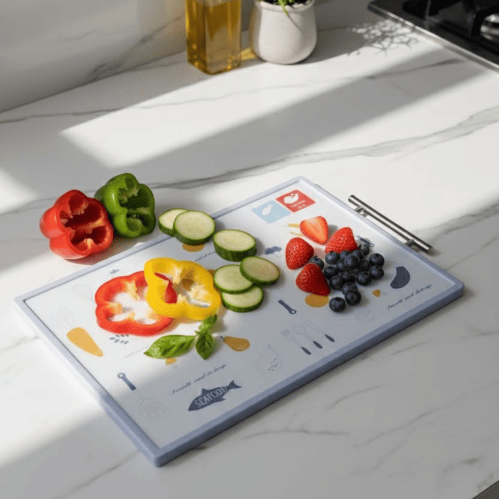 الآن يمكنك الجمع بين النظافة، المتانة، والأناقة في قطعة واحدة! لوح تقطيع ذكي بوجهين مختلفين ليلبي كل احتياجاتك في المطبخ.