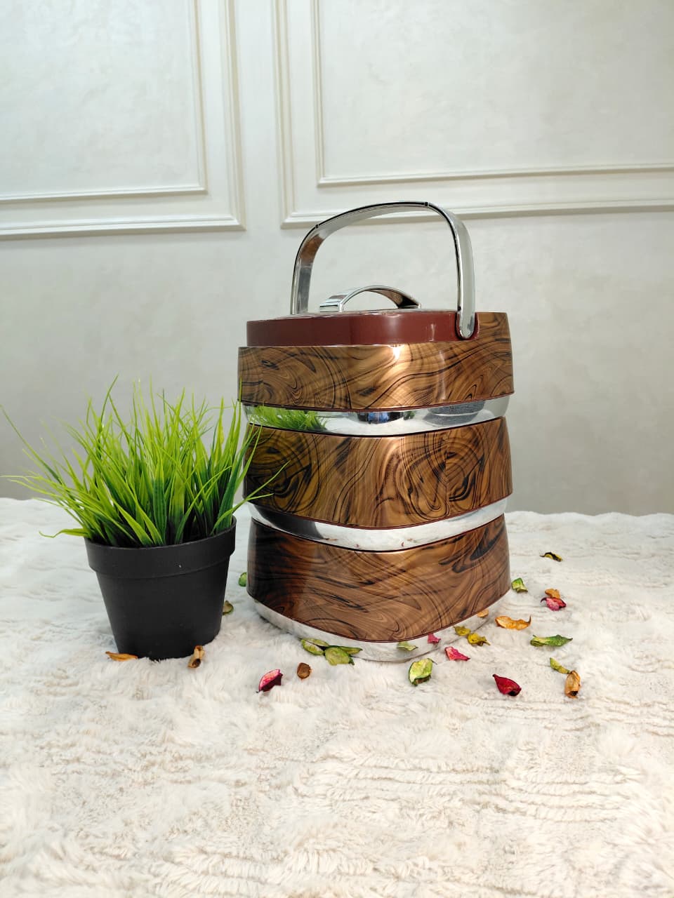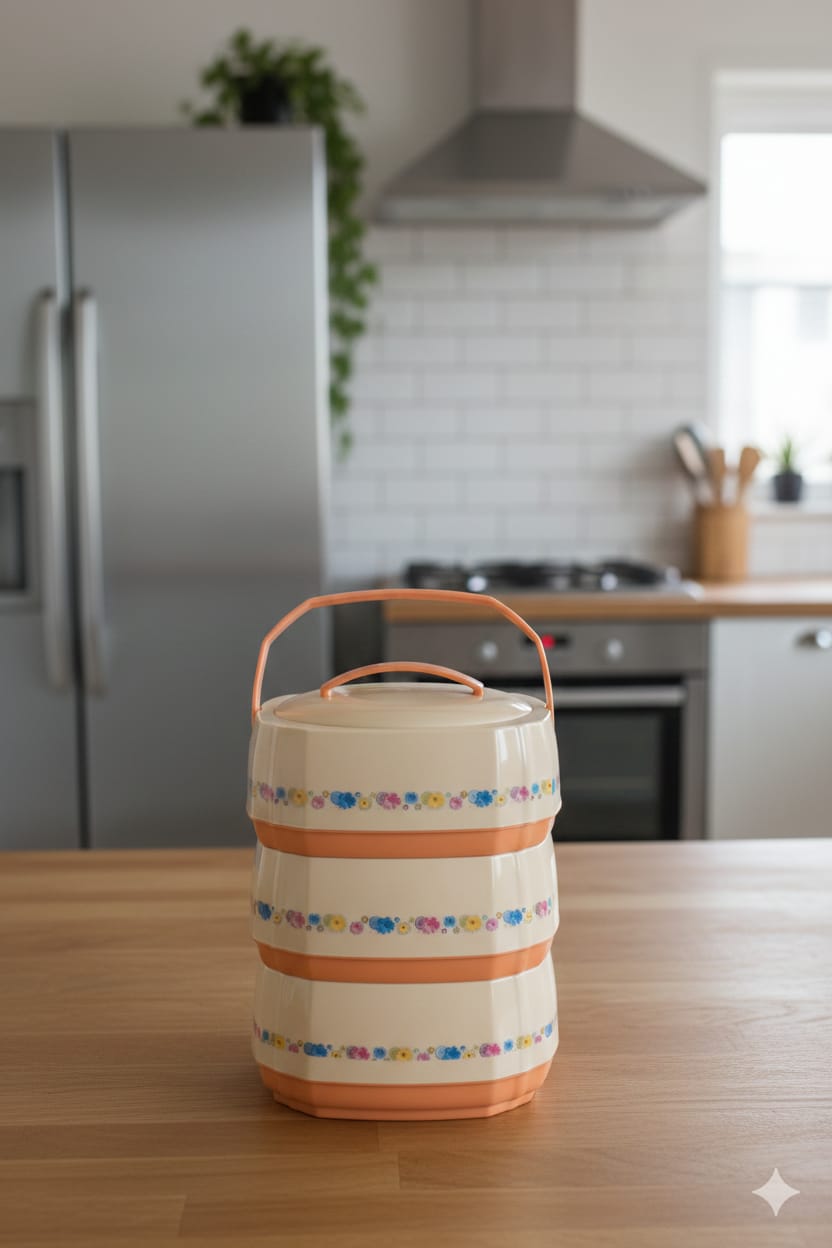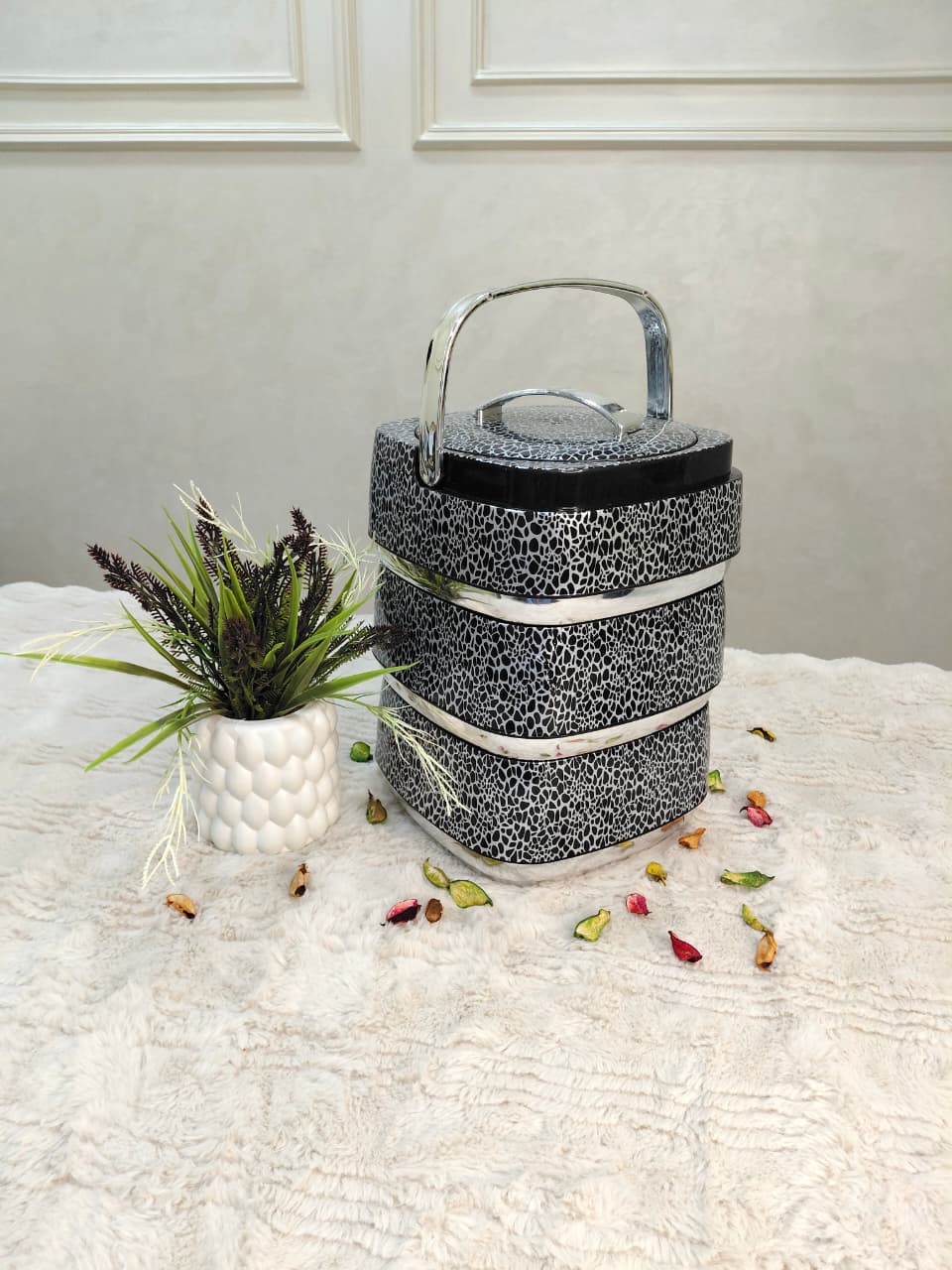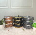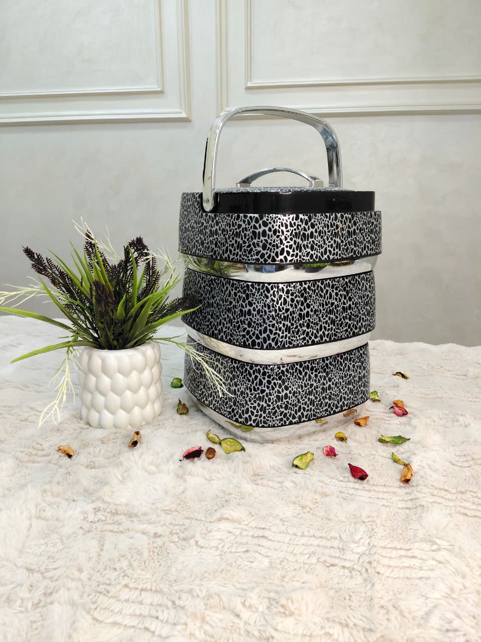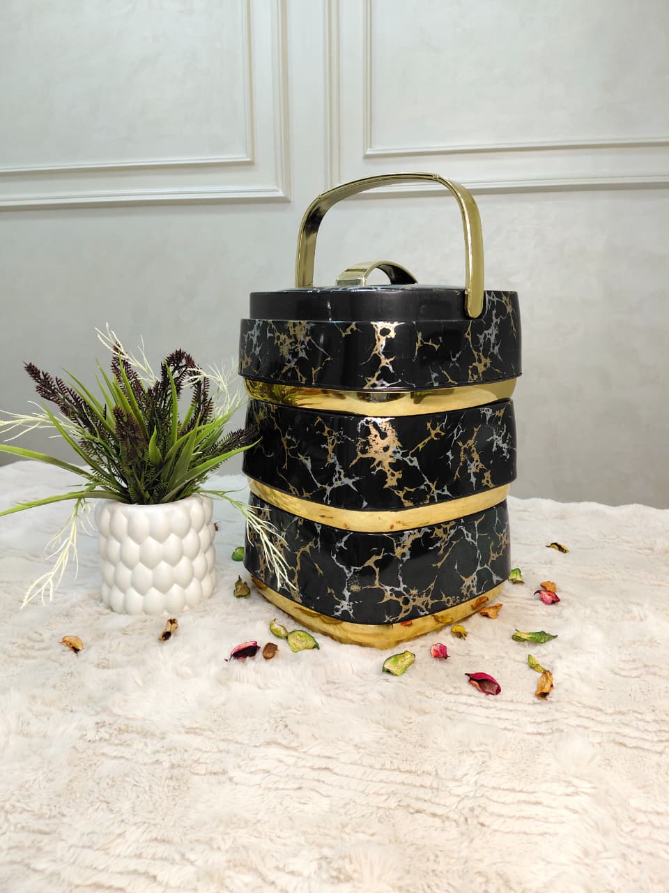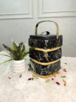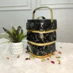حافظة طعام أنيقة بتصميم رخامي أسود مع تفاصيل ذهبية فاخرة، تحافظ على حرارة أو برودة الطعام لفترات طويلة.تتكون من 3 طبقات منفصلة لتخزين أنواع مختلفة من الأطعمة دون خلطها.