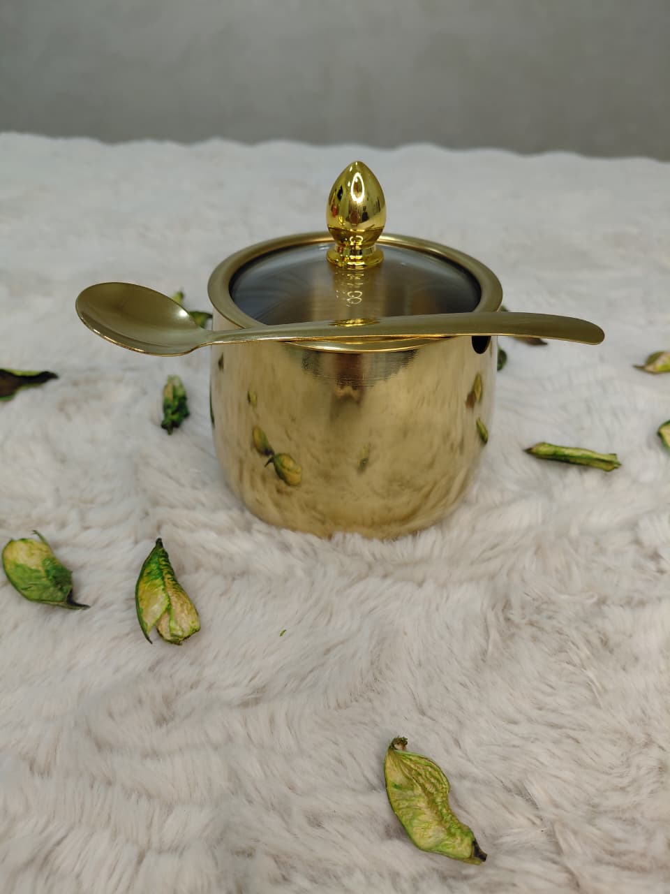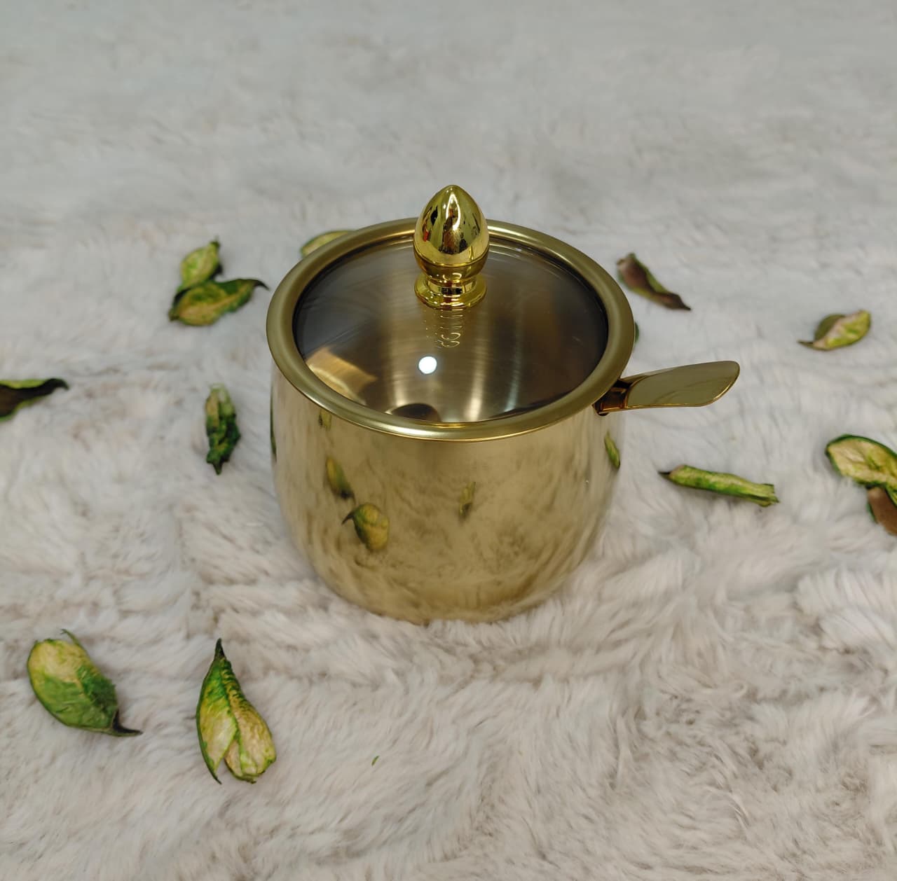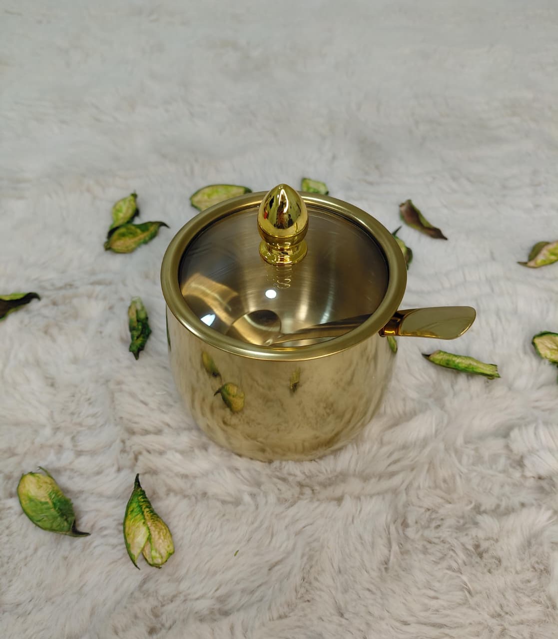 وعاء السكر المصنوع من الفولاذ المقاوم للصدأ مع غطاء زجاجي شفاف أواني توابل ناعمة وحاوية سكر مضغوطة وبرطمان توابل قابل لإعادة الاستخدام وحاوية توابل للحلوى المالحة (ذهبية)