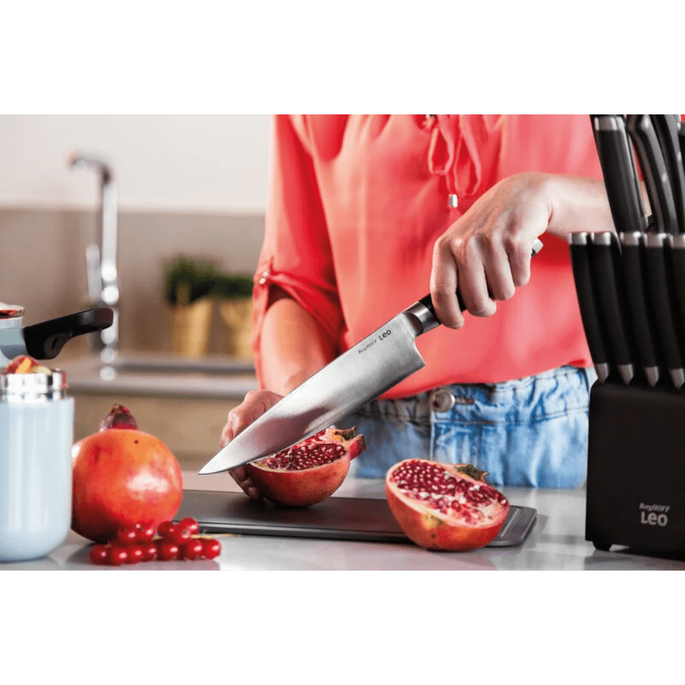 الوصف:امنح مطبخك أداءً احترافيًا مع سكين الشيف بطول 20 سم من مجموعة Graphite. مصمم ليكون الأداة الأساسية في أي مطبخ، فهو يجمع بين الدقة والراحة بفضل توازنه المثالي ووزنه المدروس.
