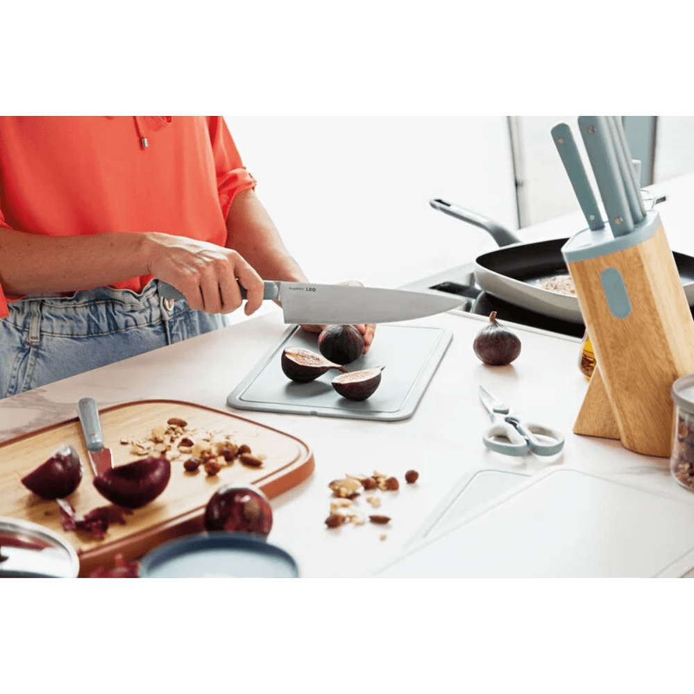 سكين الشيف من مجموعة Leo – Glints يجمع بين الكفاءة العالية والمظهر العصري، مما يجعله خيارًا مثاليًا للاستخدام اليومي في المطبخ. مصمم بشفرة واسعة من الفولاذ المقاوم للصدأ تتيح تقطيع مختلف المكونات بسرعة ودقة، سواء كانت لحومًا، خضروات أو دواجن.