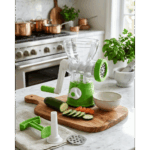 تعدد الاستخدامات: تأتي بـ 4 أسلحة (شفرات) مختلفة لبشر وتقطيع الخضروات بأشكال متنوعة (بشر ناعم، بشر عريض، شرائح شيبسي، وتقطيع طولي)، بالإضافة إلى مقشرة يدوية خارجية.