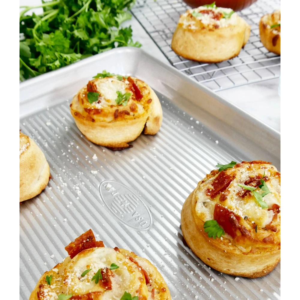 الأبعاد:مساحة الخَبز: ‎12.5 × 9 × 1 إنشالأبعاد الكاملة: ‎13 × 9.5 × 1 إنشالمادة: فولاذ ألومنيومالطلاء: Americoat® سيليكون غير لاصق، معتمد وآمن للطعام (معتمد من FDA)