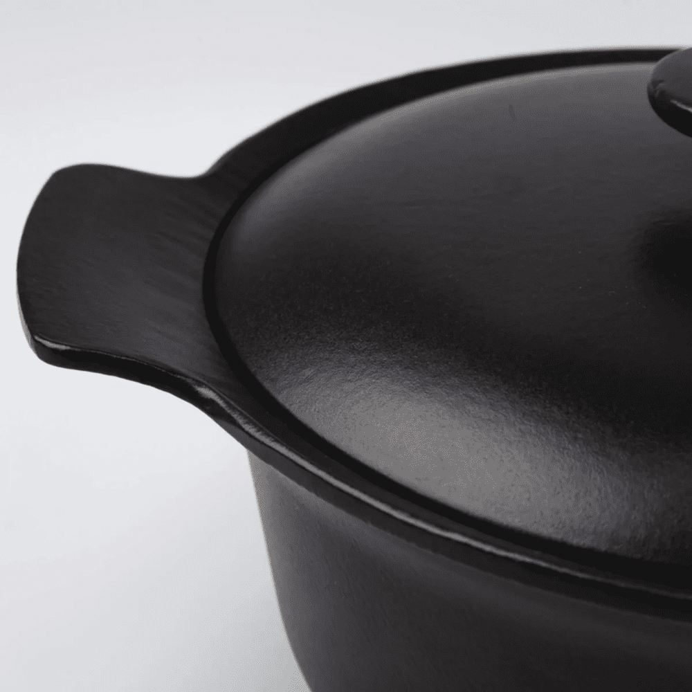 مصنوع من الحديد الزهر ببطانة داخلية مطلية بالمينا لتوزيع مثالي للحرارة والاحتفاظ بها لفترات طويلة.