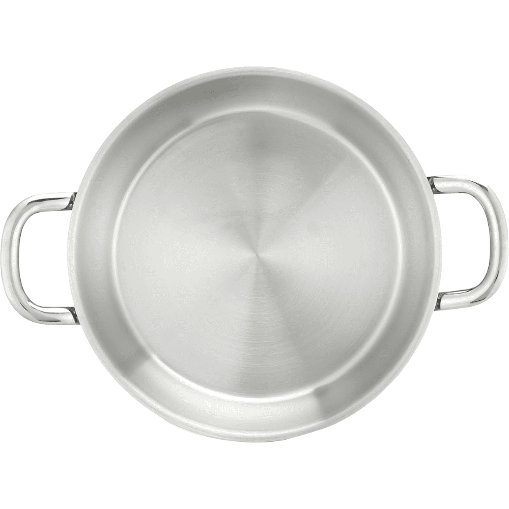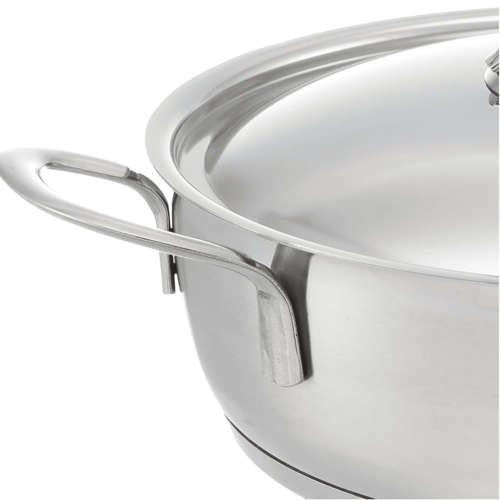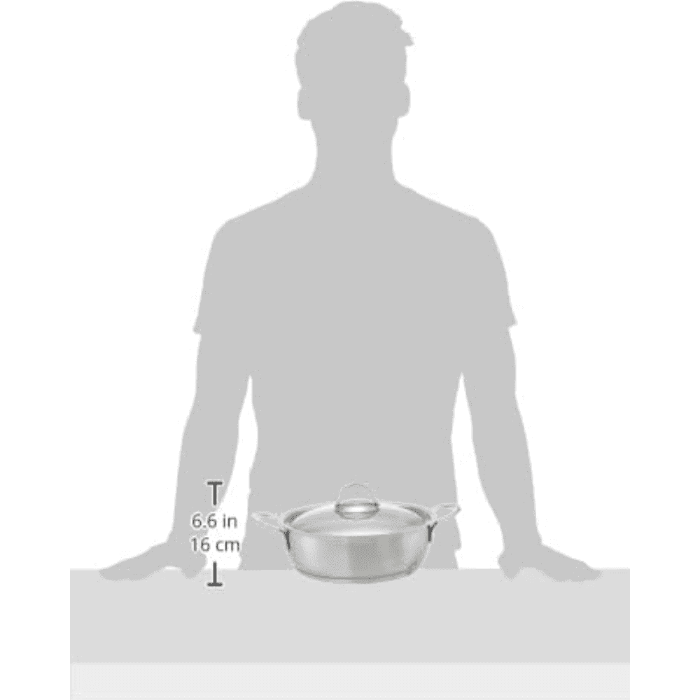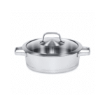 مصنوع من فولاذ مقاوم للصدأ 18/10 مع تشطيب خارجي غير لامع (مات).مزوّد بمقابض أنيقة من الستانلس ستيل لراحة وأمان أثناء الاستخدام.يأتي مع غطاء من الزجاج المقاوم للحرارة وحافة من الستانلس ستيل.