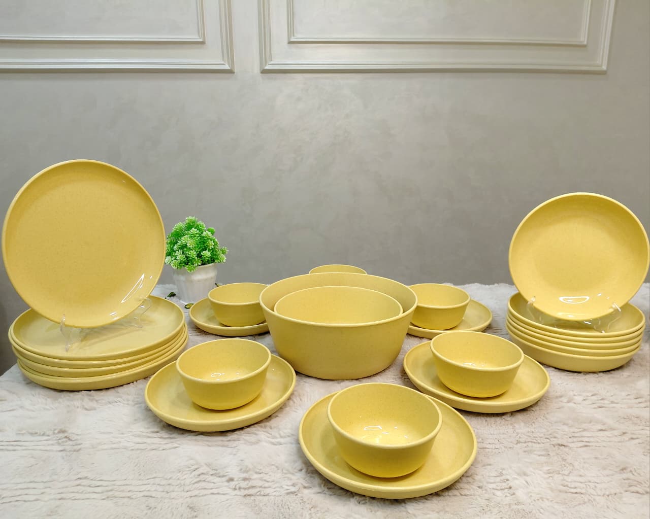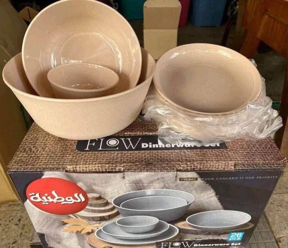 يتكون من 6 بوله صغيرة / 6 طبق مسطح وسط / 6 طبق مسطح كبير / 6 طبق غويط / 1 بولة سلطانيه وسط /1 بولة سلطانيه كبير