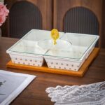 يتميز الطقم بـ نقوش أندلسية دقيقة تعكس الطابع التراثي الراقي، مع تقسيم عملي يساعدك على تنظيم أكثر من نوع تسالي في نفس الوقت. كما يأتي مع غطاء زجاج شفاف للحفاظ على المحتوى نظيفًا، وقاعدة خشبية قوية تضيف لمسة دفء وفخامة لسفرة الضيافة.