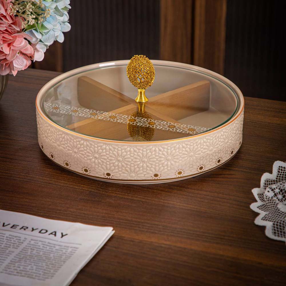 غطاؤه الشفاف يحافظ على نضارة المحتويات، بينما يضيف المقبض المزخرف لمسة فخمة تعكس ذوقك الرفيع.