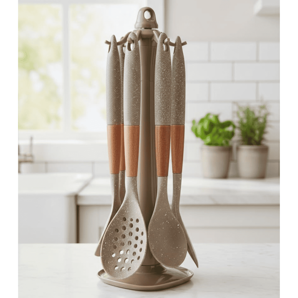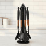 توفير مساحة: يتضمن الطقم حاملاً مركزياً يتيح تعليق الأدوات بشكل منظم، مما يوفر مساحة على سطح المطبخ ويجعل الوصول إليها سريعاً وسهلاً