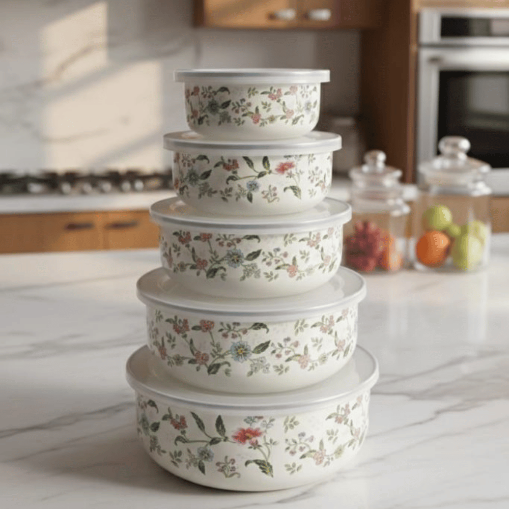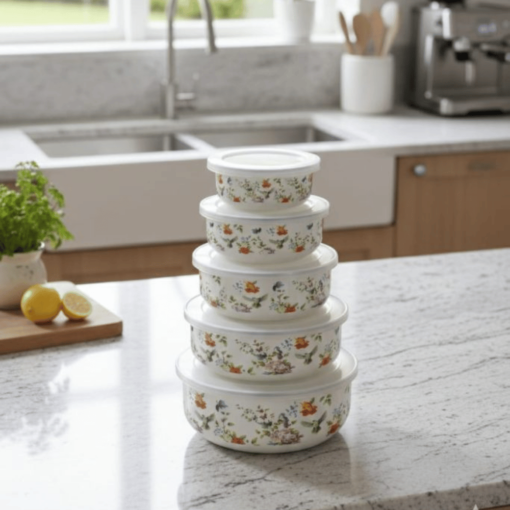 ​تعدد المقاسات: يتكون الطقم من 5 قطع متدرجة الأحجام (نظام العش)، مما يسمح بحفظ مختلف كميات الطعام، ويوفر مساحة كبيرة عند التخزين حيث توضع جميعها داخل بعضها البعض.