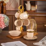 طقم كامل يحتوي على أكواب، أطباق شاي، وحامل منظم يمنحك مظهرًا مثاليًا عند التقديم.