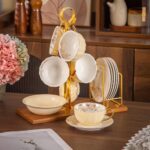 طقم كامل يحتوي على أكواب، أطباق شاي، وحامل منظم يمنحك مظهرًا مثاليًا عند التقديم.