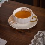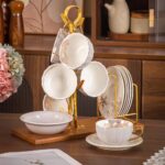 طقم كامل يحتوي على أكواب، أطباق شاي، وحامل منظم يمنحك مظهرًا مثاليًا عند التقديم.