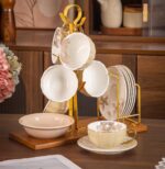 طقم كامل يحتوي على أكواب، أطباق شاي، وحامل منظم يمنحك مظهرًا مثاليًا عند التقديم.
