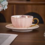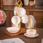 طقم كامل يحتوي على أكواب، أطباق شاي، وحامل منظم يمنحك مظهرًا مثاليًا عند التقديم.