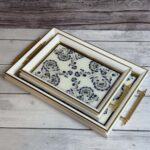 الصواني مزودة بمقابض جانبية لسهولة الحمل والثبات أثناء التقديم، مما يجعلها مثالية لتقديم المشروبات، الحلويات، الفطور، أو الاستخدام كقطع ديكور على الطاولات. كما يمكن استخدامها في المطبخ لتنظيم الأدوات أو في غرف المعيشة لتقديم الضيافة بشكل أنيق.