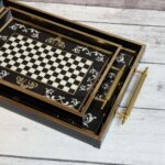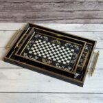 الصواني مزودة بمقابض جانبية لسهولة الحمل والثبات أثناء التقديم، مما يجعلها مثالية لتقديم المشروبات، الحلويات، الفطور، أو الاستخدام كقطع ديكور على الطاولات. كما يمكن استخدامها في المطبخ لتنظيم الأدوات أو في غرف المعيشة لتقديم الضيافة بشكل أنيق.