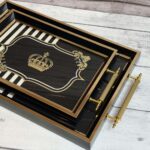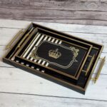 الصواني مزودة بمقابض جانبية لسهولة الحمل والثبات أثناء التقديم، مما يجعلها مثالية لتقديم المشروبات، الحلويات، الفطور، أو الاستخدام كقطع ديكور على الطاولات. كما يمكن استخدامها في المطبخ لتنظيم الأدوات أو في غرف المعيشة لتقديم الضيافة بشكل أنيق.