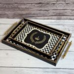 الصواني مزودة بمقابض جانبية لسهولة الحمل والثبات أثناء التقديم، مما يجعلها مثالية لتقديم المشروبات، الحلويات، الفطور، أو الاستخدام كقطع ديكور على الطاولات. كما يمكن استخدامها في المطبخ لتنظيم الأدوات أو في غرف المعيشة لتقديم الضيافة بشكل أنيق.