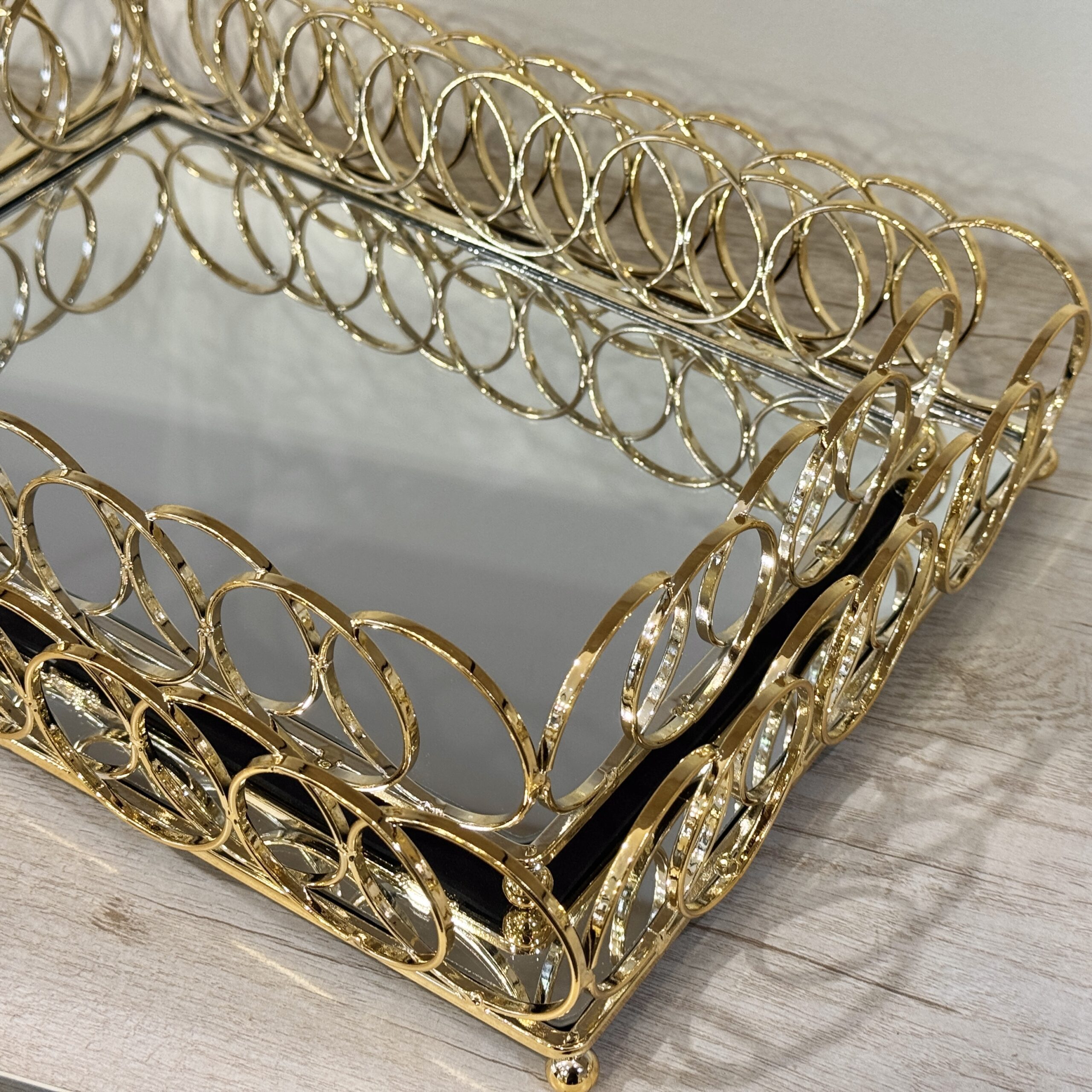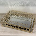 صينية ديكور ذهبية بمرآة تضيف لمسة فاخرة وأنيقة لأي ركن في منزلك. تتميز بتصميم راقٍ بإطار ذهبي ولمسة مرآة عاكسة تعزز من جمال المكان.