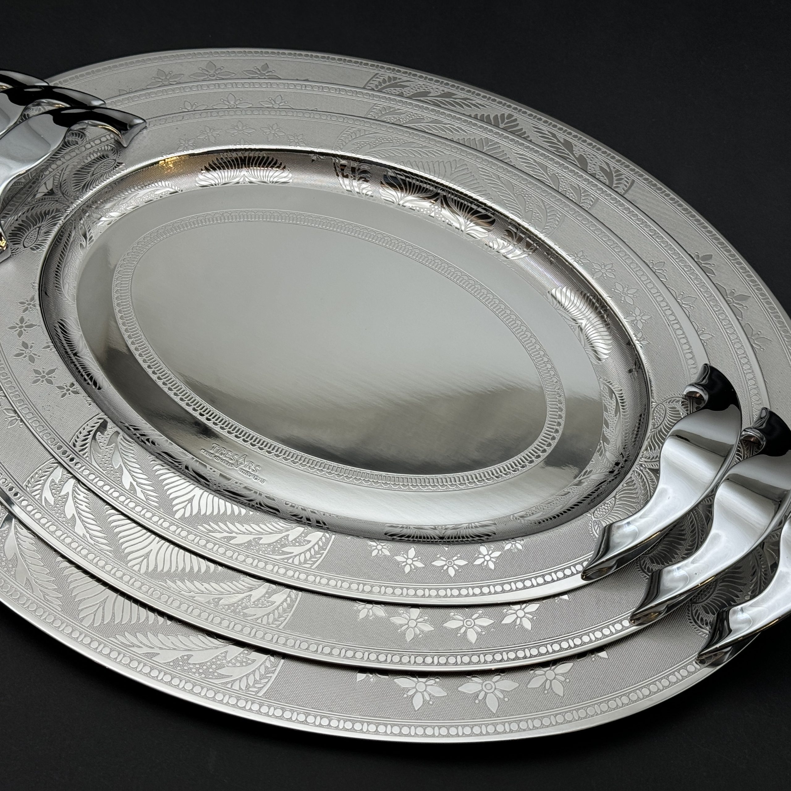طقم صواني إيطالي 3 قطع – Oval Naif Inoxالماركة: Tressors | بلد الصنع: إيطالياالخامة: استانلس ستيل 10/18عدد القطع: 3