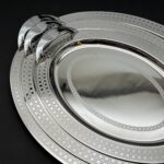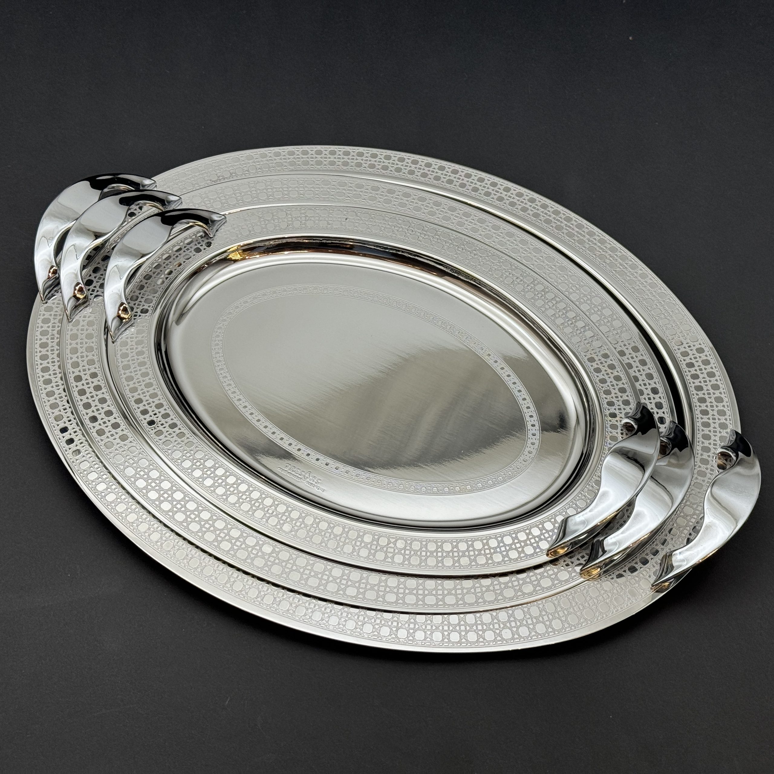 صواني تقديم فاخرة بتصميم بيضاوي أنيق من Tressors، مصنوعة في إيطاليا من خامة استانلس عالية الجودة لمتانة ولمعان يدوم. مثالية لتقديم الحلويات والمشروبات في المناسبات الخاصة والضيافة.
