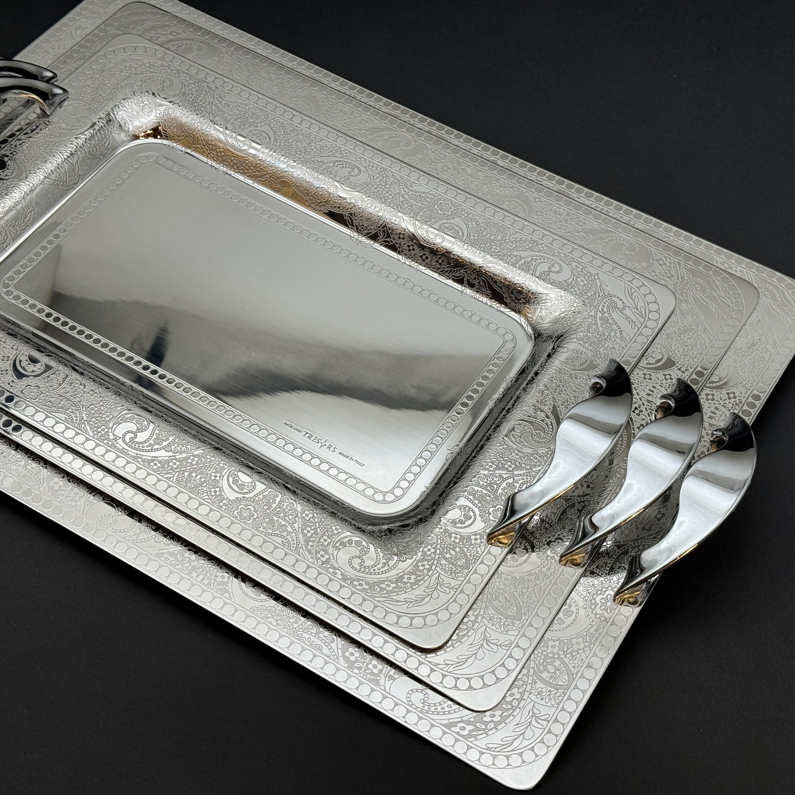 الوصف:طقم صواني فاخر من Tressors الإيطالية، بتصميم مستطيل أنيق وجودة عالية من الاستانلس ستيل المقاوم للصدأ. عملي وجذاب في آنٍ واحد – مناسب لتقديم المشروبات والحلويات أو حتى كقطعة ديكور راقية.