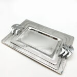 الوصف:طقم صواني بتصميم مستطيل أنيق من الستانلس ستيل عالي الجودة. يتميز بلمعانه الفضي وخامته المتينة المقاومة للصدأ، ما يجعله خيارًا مثاليًا للتقديم أو كقطعة ديكور راقية في أي مناسبة.