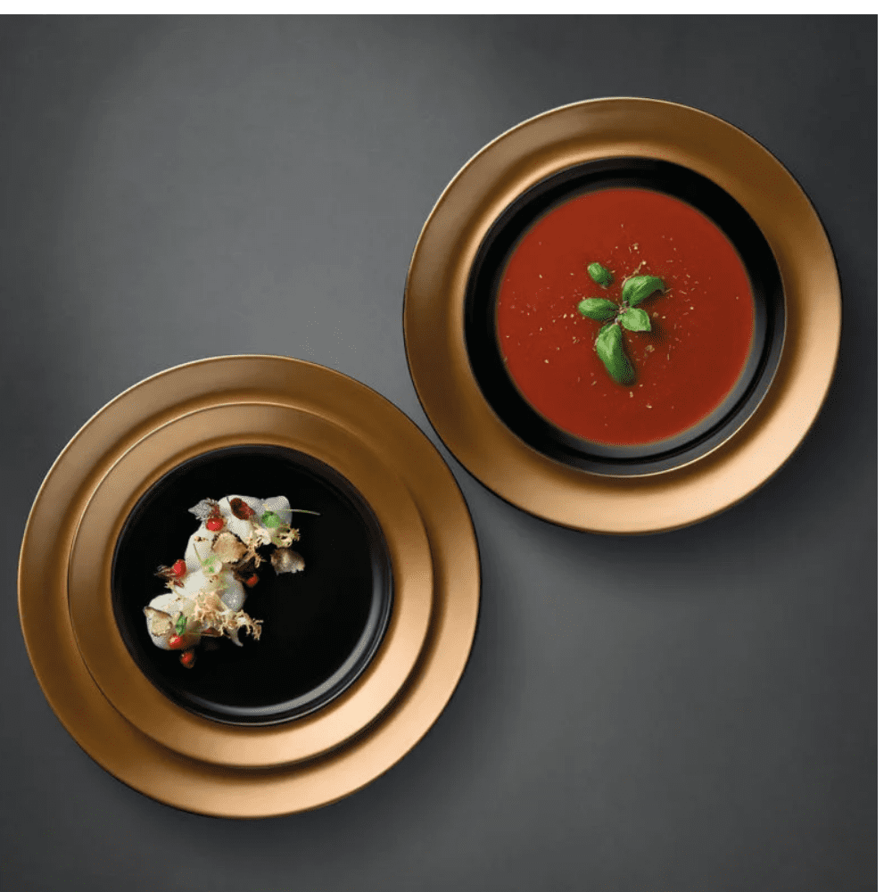 يتميّز بتصميم فريد يجمع بين لون أسود راقٍ وحافة ذهبية لامعة تضيف لمسة فاخرة على كل طبق تقدّمينه، سواء كان مقبلات، طبق رئيسي أو شوربة دافئة.