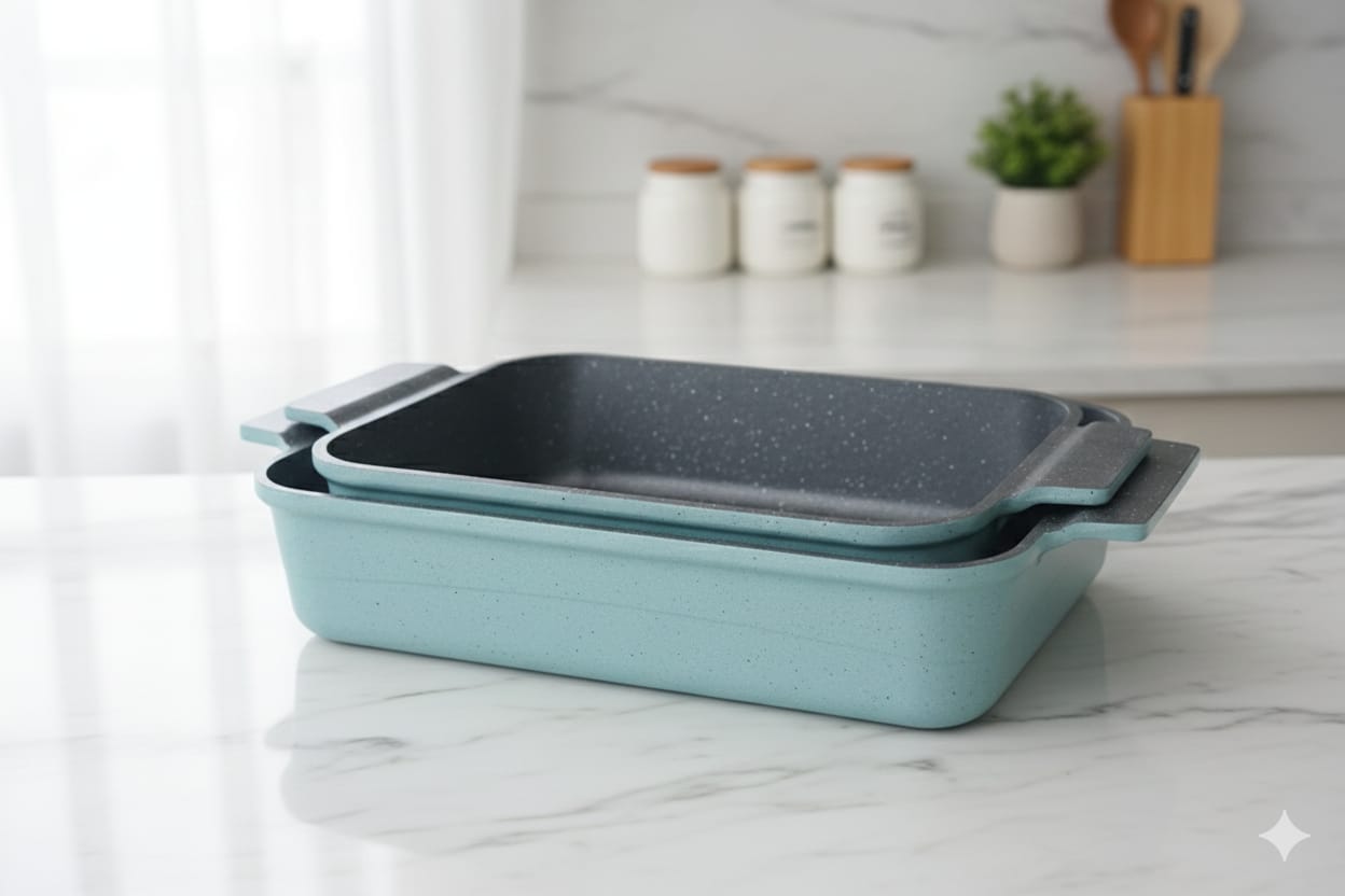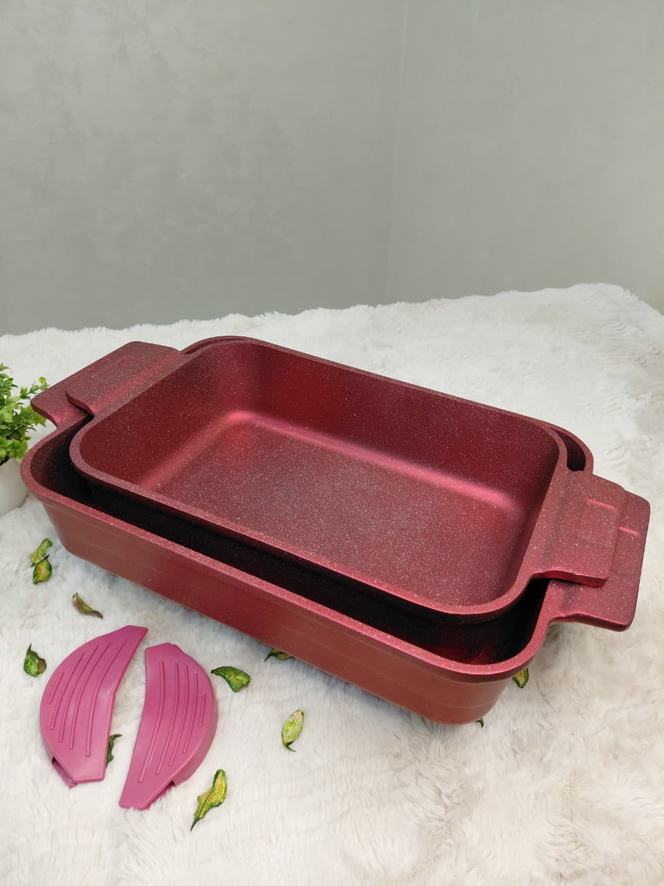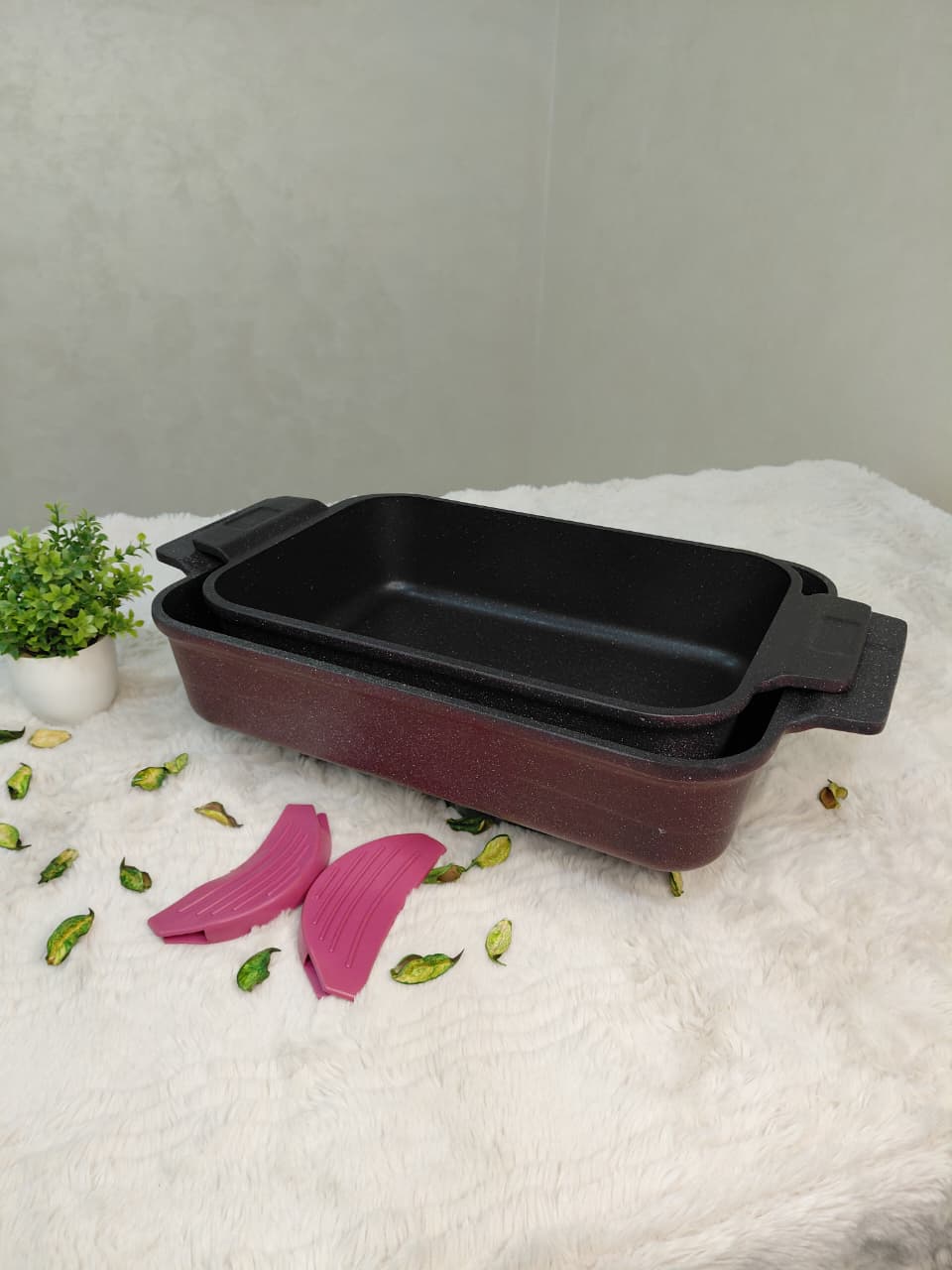 مجموعة من 4 قطع تتضمن طاجينتين ومقبضين. يتميز الطقم بطلاء غير لاصق بجودة إيطالية ويأتي بأحجام 35 سم و30 سم.