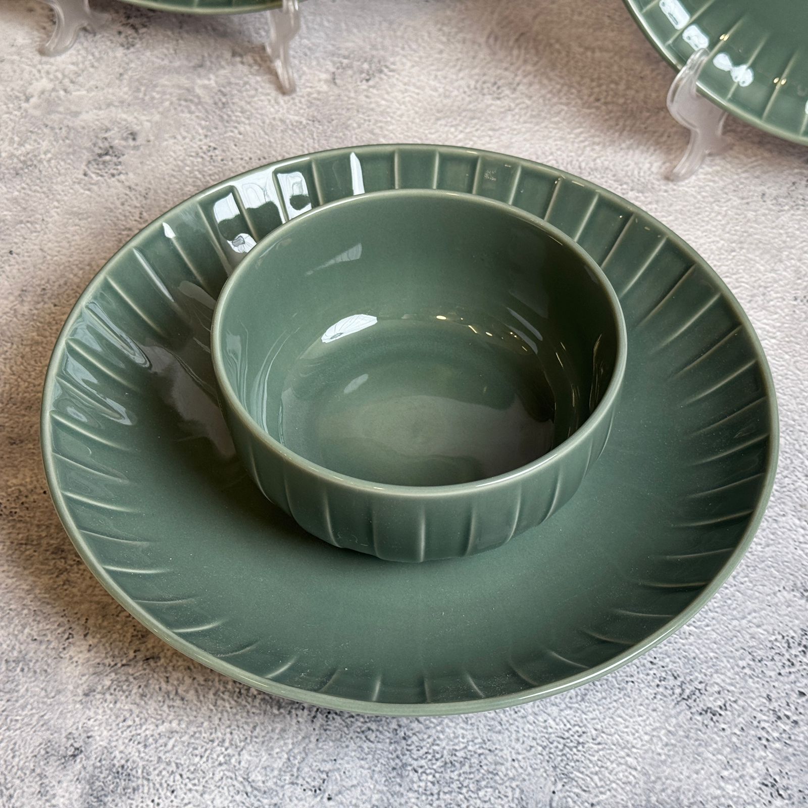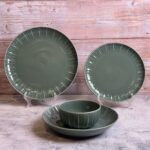 طقم عشاء تايلاندي بتصميم عصري ولون زيتي يضيف لمسة من الرقي والهدوء على سفرتك. مصنوع من بورسلين عالي الجودة، آمن للاستخدام في الميكروويف وغسالة الأطباق، مثالي للاستخدام اليومي والمناسبات الخاصة.