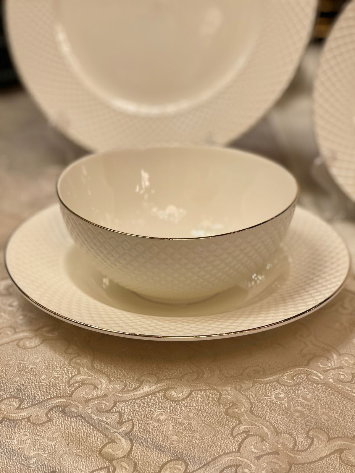 اجعلي سفرتك أكثر أناقة مع طقم العشاء CA06 المصنوع من New Bone China بلمعته الناعمة ولمسته الراقية. تصميم أنيق وخفيف الوزن، مثالي للعزومات والاستخدام اليومي، ويمنحك تجربة تقديم راقية ومتكاملة.