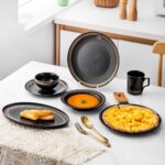 طقم عشاء فاخر باللون الأسود الأنيق، يجمع بين التصميم العصري والوظيفة العملية، مثالي للسفرة المودرن والمناسبات الخاصة. مصنوع من بورسلين عالي الجودة، آمن للاستخدام في غسالة الأطباق والميكروويف لراحة يومية وسهولة في التنظيف.