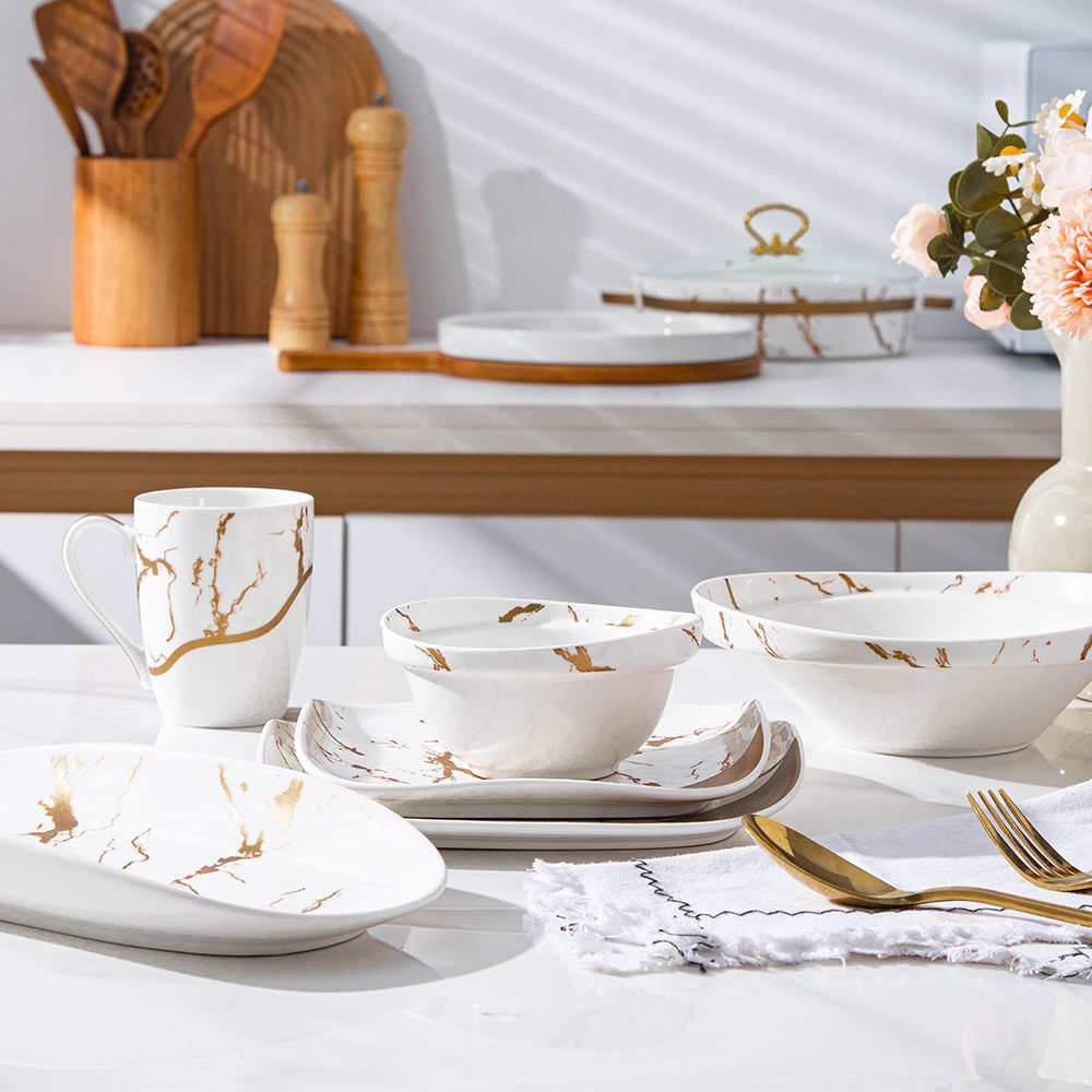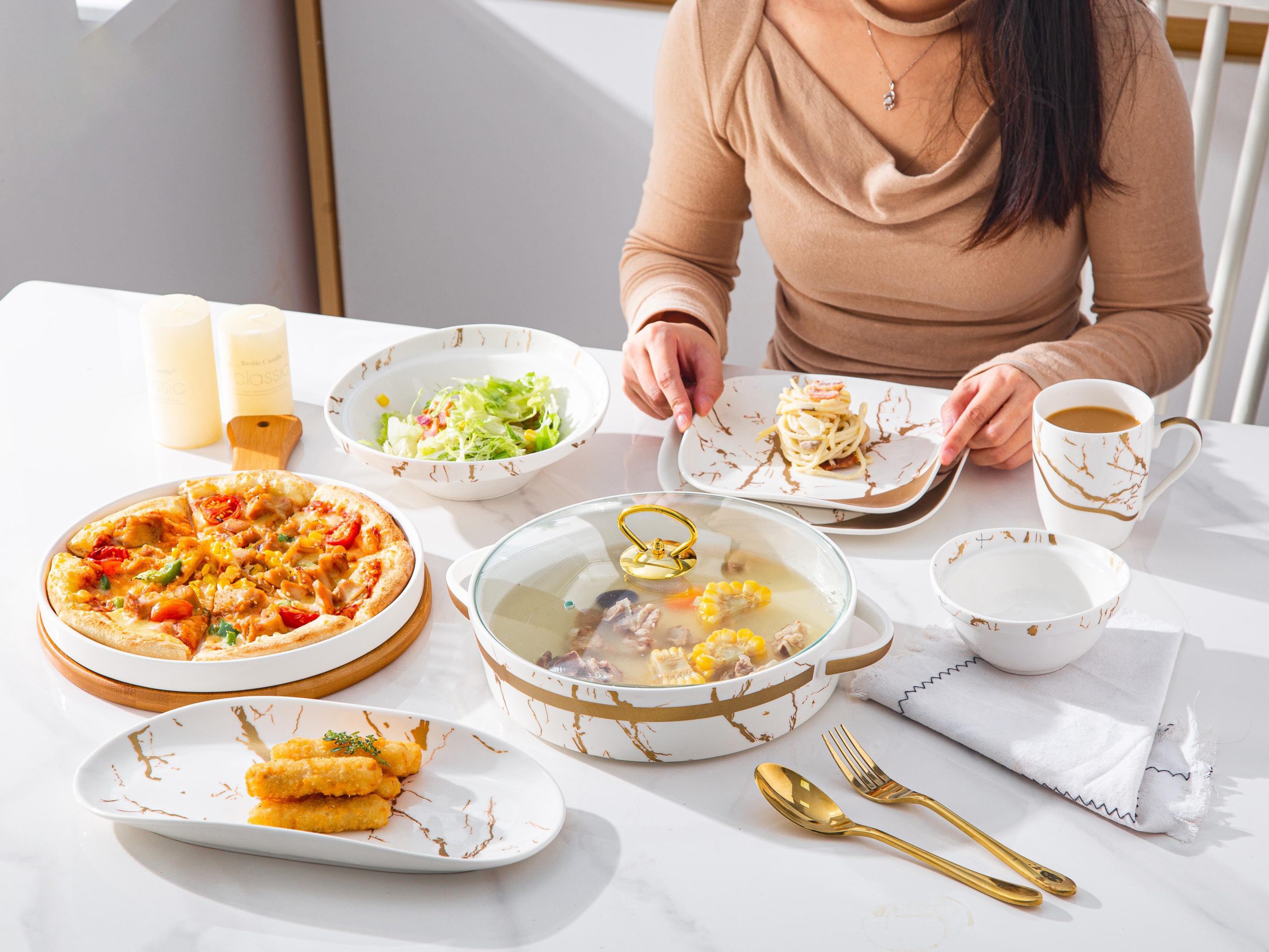 طقم عشاء فاخر بنقشة نقط ذهبية أنيقة، تصميم عصري يضفي لمسة فخامة وإشراقة على كل مناسبة. مصنوع من بورسلين عالي الجودة، آمن للاستخدام في الميكروويف وغسالة الأطباق، ليوفر لك تجربة عملية بجانب المظهر الراقي.