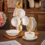 طقم القهوة بالحامل هو اختيار مثالي لكل من يبحث عن الأناقة والعملية في آن واحد. يتميز الطقم بتصميم راقٍ يجمع بين الهدوء والفخامة، مع حامل معدني ذهبي يُسهّل تنظيم الطقم ويمنحه مظهرًا جذّابًا يناسب جميع ديكورات المنزل.مصنوع من خامات سيراميك عالية الجودة، ليمنحك تجربة ضيافة متكاملة تدوم لفترة طويلة دون بهتان أو خدوش.