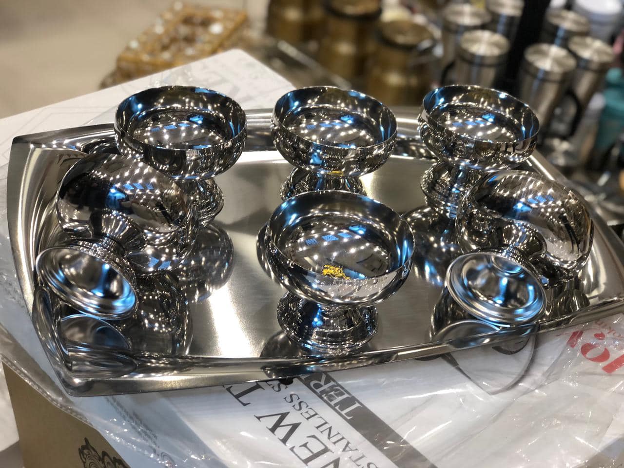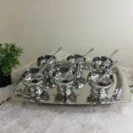 طقم كاس مكون من 6 كاس جيلي استانلس + 6 معلقه صغيره استانلس + صينية تقديم استانلس