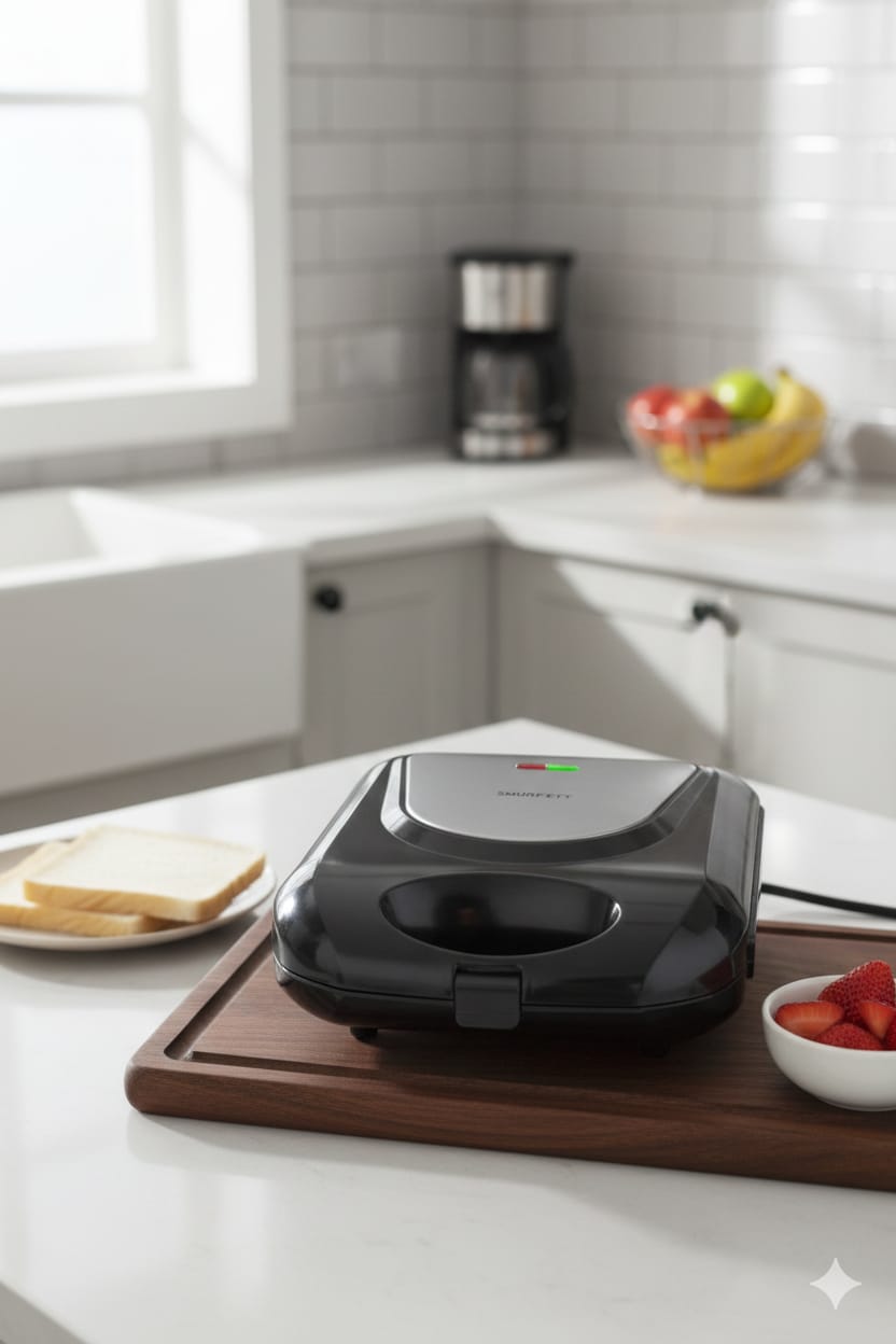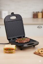 تصميم السطح: الجهاز مزود بصفائح داخلية مضلعة (Grill Plates)، مما يجعله مثالياً لعمل علامات الشواء على الخبز واللحوم.