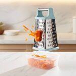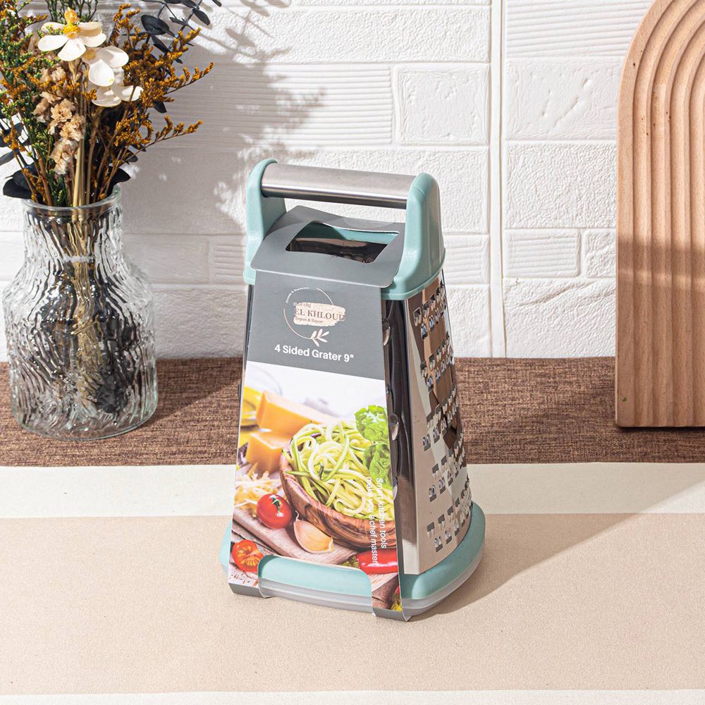 مبشرة عملية مصنوعة من استانلس ستيل عالي الجودة مزودة بخزان سفلي لتجميع الخضروات أو الجبن أثناء البشر، مما يساعد على الحفاظ على نظافة المطبخ وتوفير الوقت أثناء التحضير.