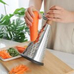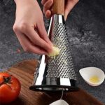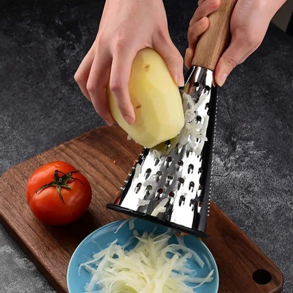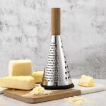 مبشرة جبن مخروطية بمقبض – مبشرة ستانلس ستيل ثلاثية الوظائف لبشر البارميزان بمقبض خشب وقاعدة مطاطية مانعة للانزلاق محمولة يدويًا متعددة الوظائف، مبشرة الجبن مع حاوية