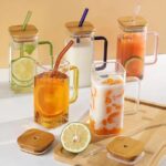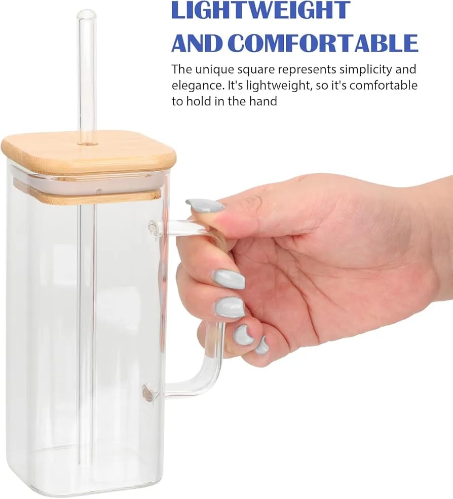 كوب زجاجي بقشة مع اغطية، أكواب شرب مربعة مع مقبض وغطاء من الخيزران