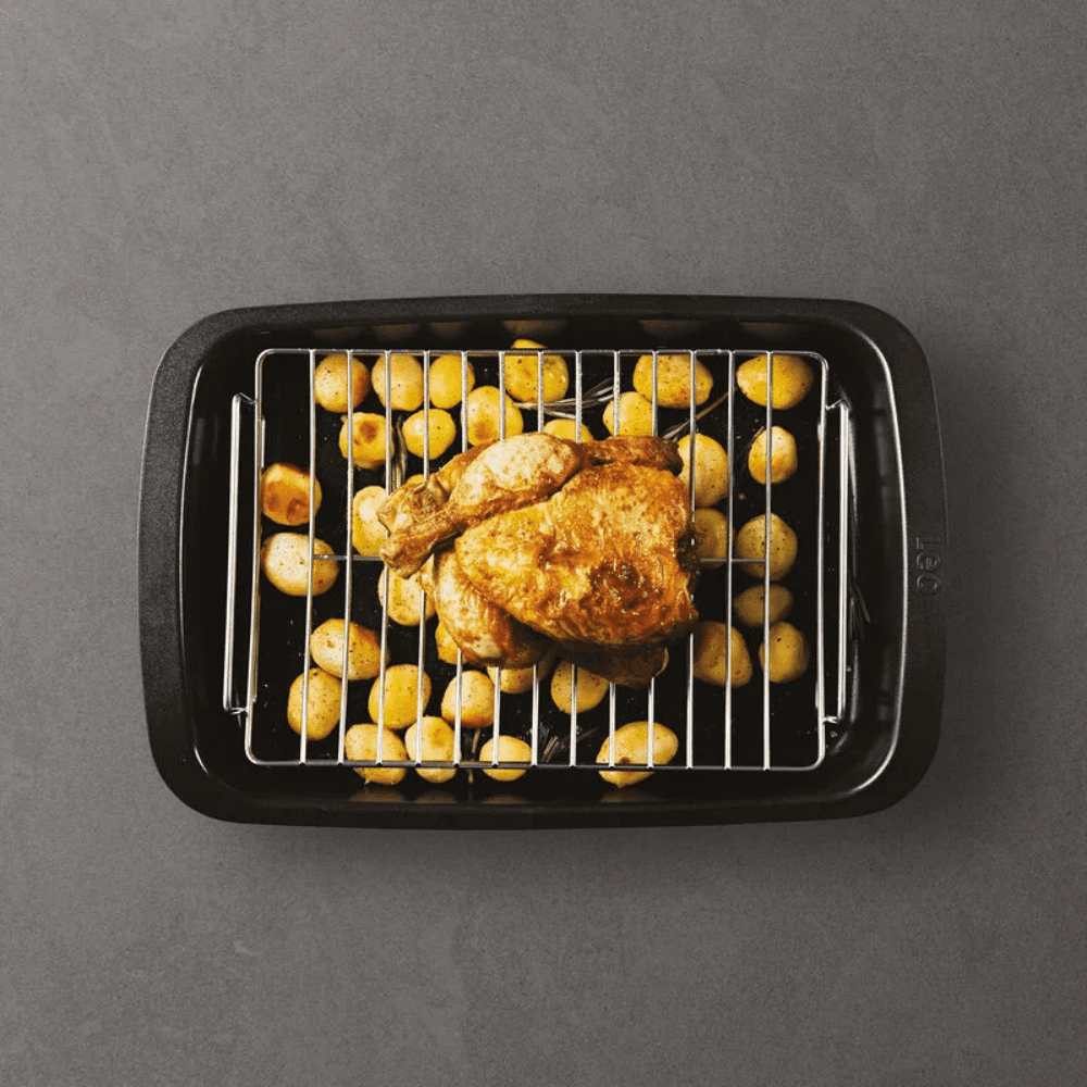 دجاجة مشوية أو جراتان دوفيينوا الشهي أو لازانيا نباتية أطباقك ستخرج مثالية مع هذه الصينية المتعددة الاستخدامات المصنوعة من الألمنيوم المعاد تدويره مع رف من الفولاذ المقاوم للصدأ قابل للإزالة تضمن الصينية توزيع حرارة متساوي على جميع أنواع المواقد بما في ذلك الحث وهي مقاومة للفرن حتى 230 درجة مئوية تتميز بطبقة سيراميك غير لاصقة عالية الجودة ومستدامة وصحية تضمن سهولة خروج الطعام وسهولة التنظيف المقابض الجانبية المريحة تضمن سهولة رفع الصينية من وإلى الفرن والرف القابل للإزالة يحافظ على ارتفاع الدواجن أو الرولادة الكبيرة من اللحم ليتم تحميرها بالتساوي ولتسرب الدهون والعصائر بحرية التصميم من بيتر روكس القاعدة كاملة من الألمنيوم المصبوب المعاد تدويره الطلاء الداخلي غير لاصق CeraGreen الطلاء الخارجي من بوليستر السيليكون مناسب لجميع مصادر الحرارة من ضمنها الحث يفضل الغسل اليدوي من سلسلة Graphite ضمن مجموعة Leo رمز المنتج 3950540 الوزن الصافي 2.06 كجم وأبعاد المنتج الداخلية 36.8 × 25.2 × 4.9 سم والأبعاد الخارجية 41.8 × 28 × 7.2 سم رمز EAN 5413821367279 نوفر لك خدمة المعاينة والفرز قبل الاستلام مع إمكانية الاسترجاع أو الاستبدال خلال 14 يومًا وشحن مؤمّن ضد الكسر