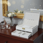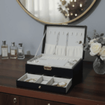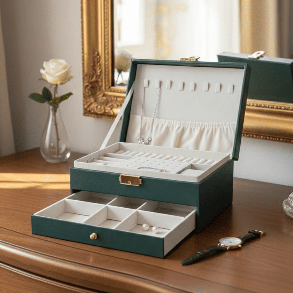 ​مساحة تخزين ذكية: يتكون من طبقتين؛ طبقة علوية مقسمة لخواتم وأقراط، ودرج سفلي واسع للساعات، الأساور، أو القطع الكبيرة.