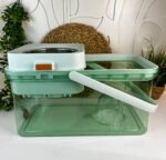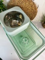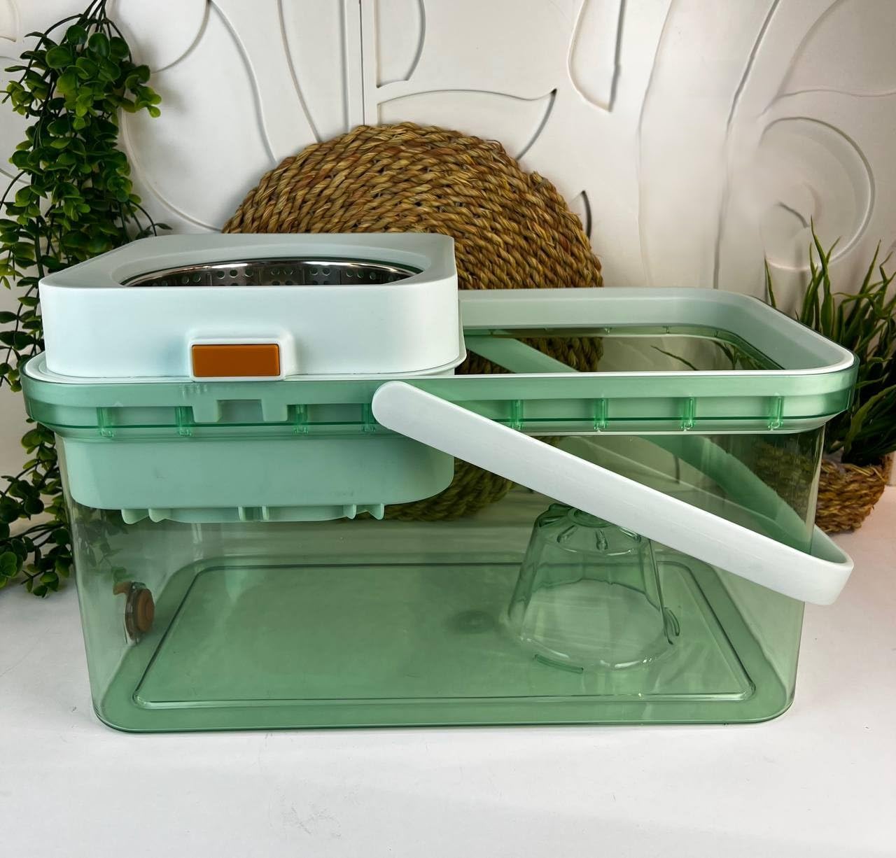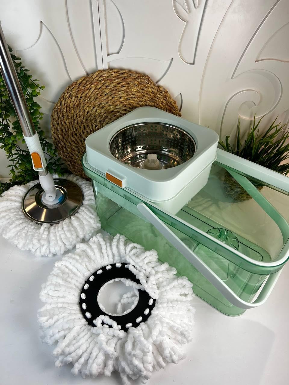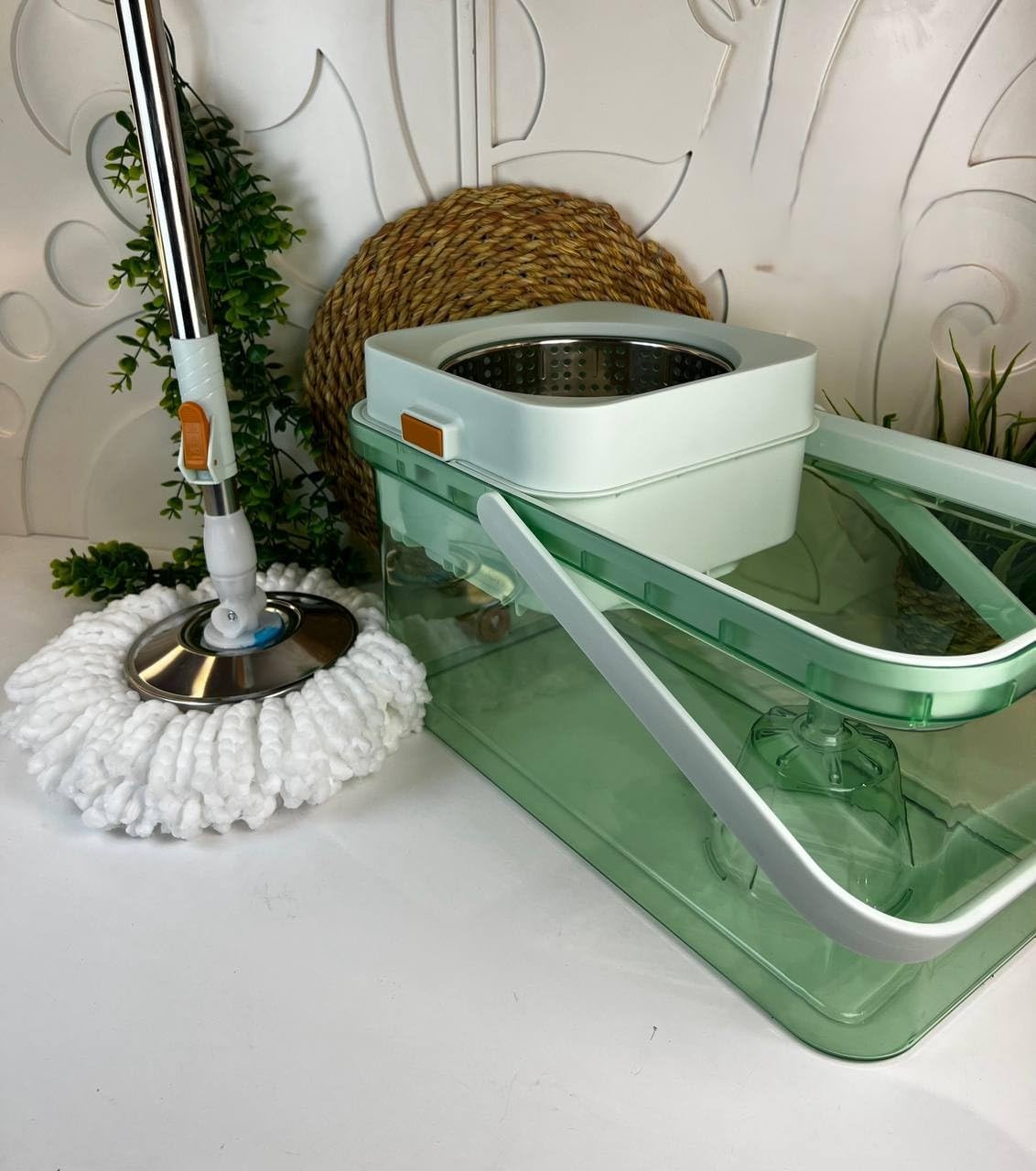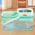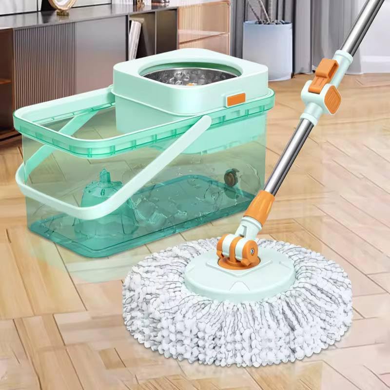 الدلو مزود بنظام عصر من الستانلس ستيل يساعد على التخلص من المياه الزائدة بسرعة، بدون الحاجة لعصر الموب باليد، مما يحافظ على نظافة اليدين ويقلل من الفوضى أثناء التنظيف. كما أن تصميم الدلو المتين مع مقبض للحمل يجعله سهل الاستخدام والتنقل داخل المنزل.
