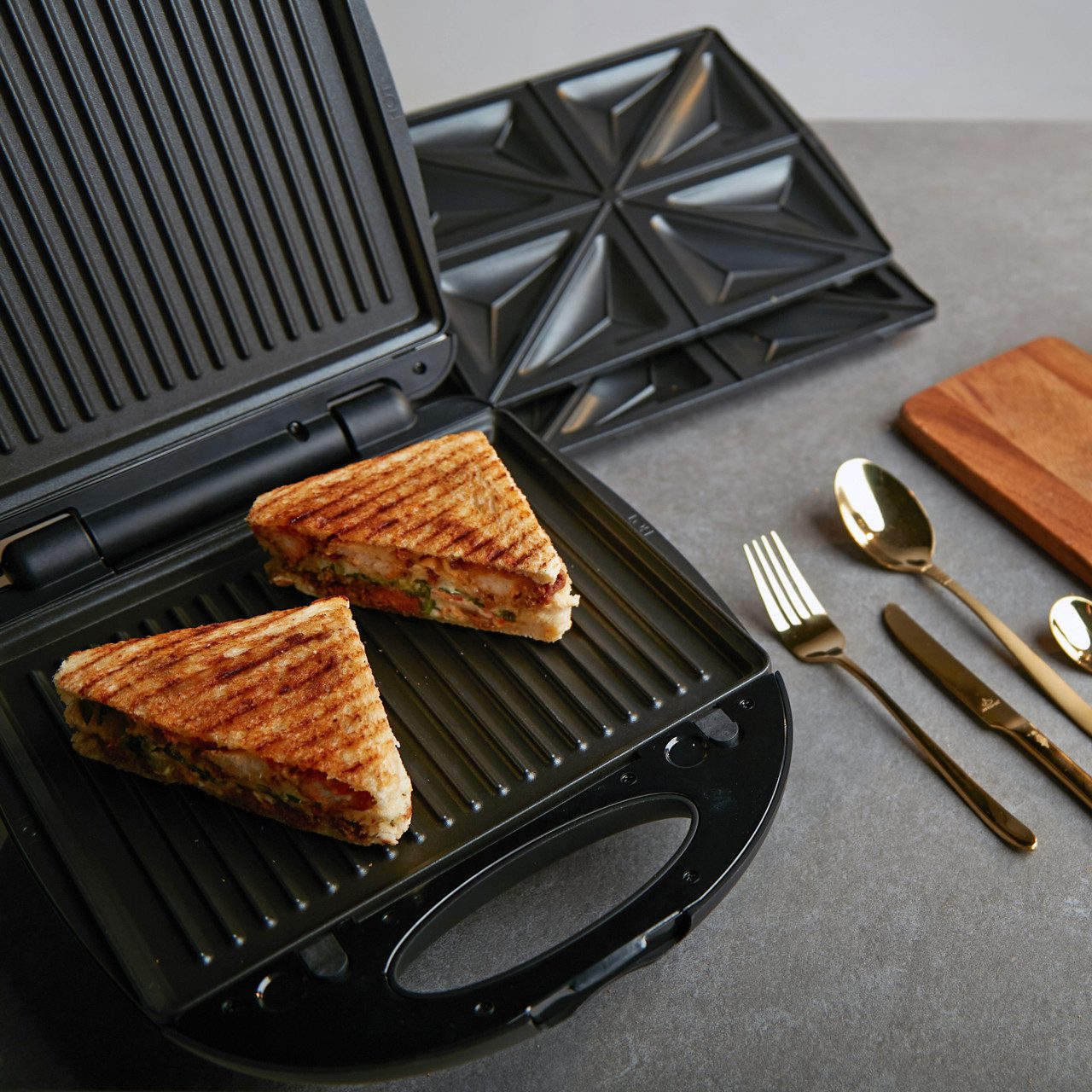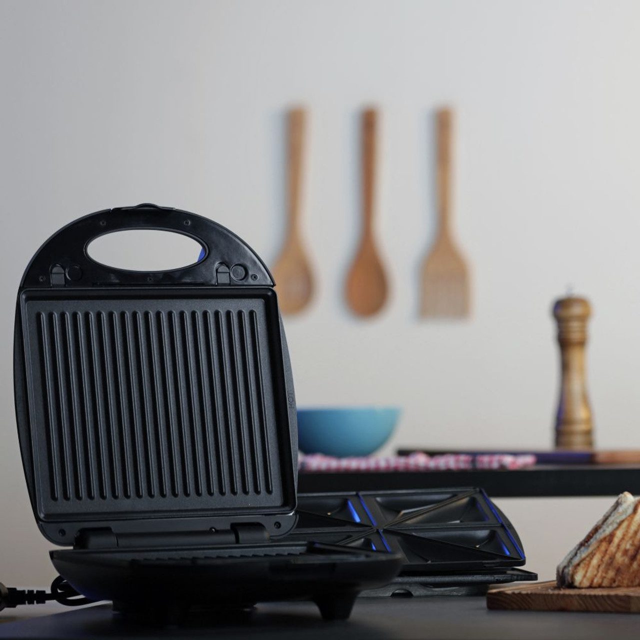 3 أطباق قابلة للتبديل – أطباق الساندويتش، وأطباق الشواء، وأطباق الوافل.