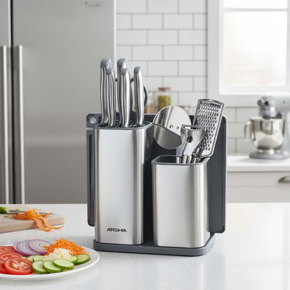 Elevate your kitchen mastery with the Arshia 11-Piece Knife Set. Designed for efficiency and convenience, this comprehensive collection instantly equips your kitchen with high-quality stainless steel cutting essentials and clever organizational accessories for any cooking task.