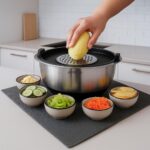 This space-saving set includes four stackable bowls with a modern matte exterior finish and a shiny mirror interior, plus a multi-use lid and three grater attachments — making everyday cooking easier and more organized.